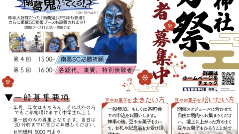 節分祭追儺式、南葛SC必勝祈願祭ご報告 2026.02.06告知 2月1日春が訪れた様な晴天の中、令和8年節分祭追儺式及び南葛SC必勝祈願祭が執り行われました。 当日は和太鼓グループ彩さんの奉納演奏パフォーマンスや、ピーポくんキュータくん、こち亀両さんの登場など大変… Read More